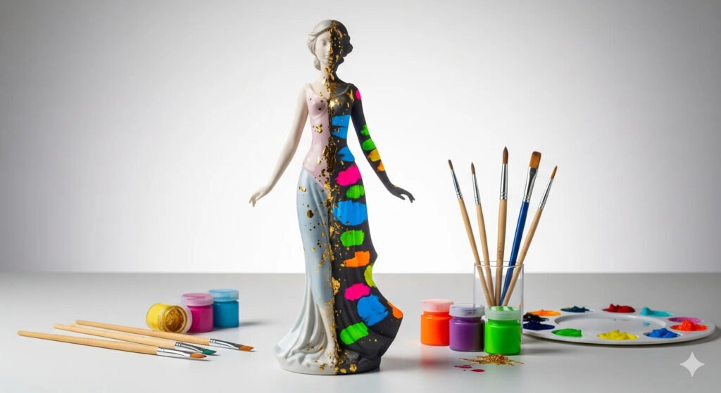 El camino hacia la transformación de una pieza Lladró es un ritual de paciencia y precisión. El secreto no está en cubrir, sino en realzar. El proceso comienza con la preparación: la pieza debe ser pulida, sellada y envejecida para que la pintura se adhiera de forma homogénea, creando esa superficie lisa y «porcelanizada» que parece natural. La magia reside en la aplicación de pigmentos translúcidos, que se superponen en capas casi invisibles. Se trabaja con tonalidades frías y neutras, creando degradados sutiles que aportan profundidad sin oscurecer.